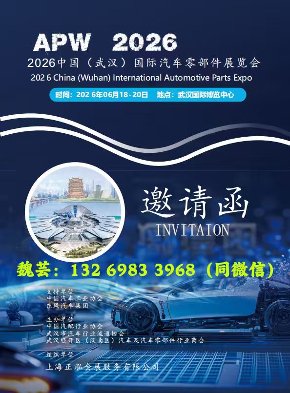 2026中國(武漢)國際汽車零部件博覽會時間:2026年6月18-20日地點:武漢國際博覽中心邀請函支持單位:中國汽車工業(yè)協(xié)會、東風(fēng)汽車集團主辦單位中國汽配行業(yè)協(xié)會、武漢市汽車行業(yè)流通協(xié)會、武漢經(jīng)開區(qū)(漢南區(qū))汽車及汽車零部件行業(yè)商會組織單位上海正泓會展服務(wù)有限公司展會背景